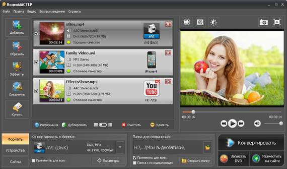Помимо конвертации уже имеющихся у вас роликов в тот или иной формат, с помощью «ВидеоМАСТЕРА» также реально эти самые ролики адаптировать для YouTube, Вконтакте, Vimeo, и даже закачать в портативное устройство вроде Apple iPhone 4s или Samsung Galaxy. Это, конечно, безусловный плюс разработчикам, ведь умение отслеживать последние тенденции немало способствует расширению аудитории потенциальных юзеров.