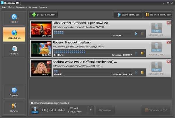 В отличие от предыдущего приложения, программа «ВидеоМАНИЯ» специализируется на загрузке видео с различных видеохостингов типа YouTube, RuTube, Vimeo. Явное созвучие с «ВидеоМАСТЕРОМ» дает о себе знать: по функционалу программы во многом схожи – обе скачивают, обе конвертируют, обе записывают DVD. Ах да, чуть не забыли упомянуть про удачно реализованный интерфейс.